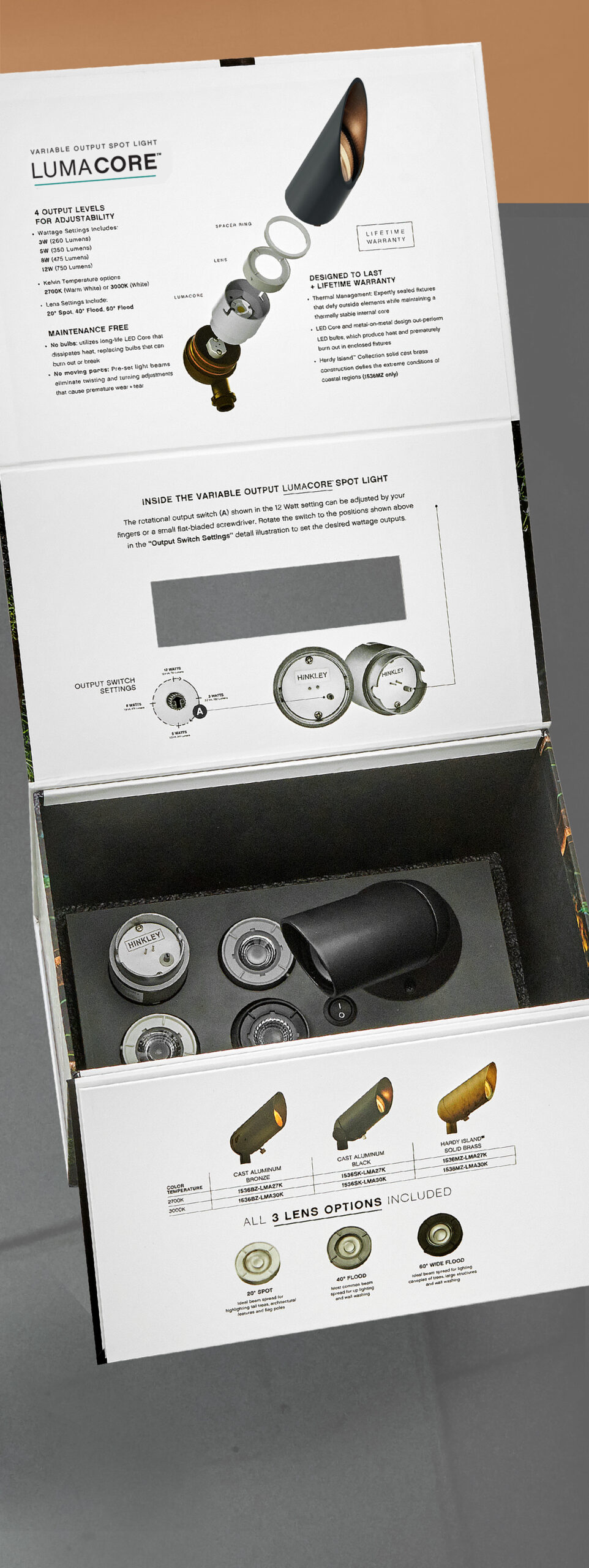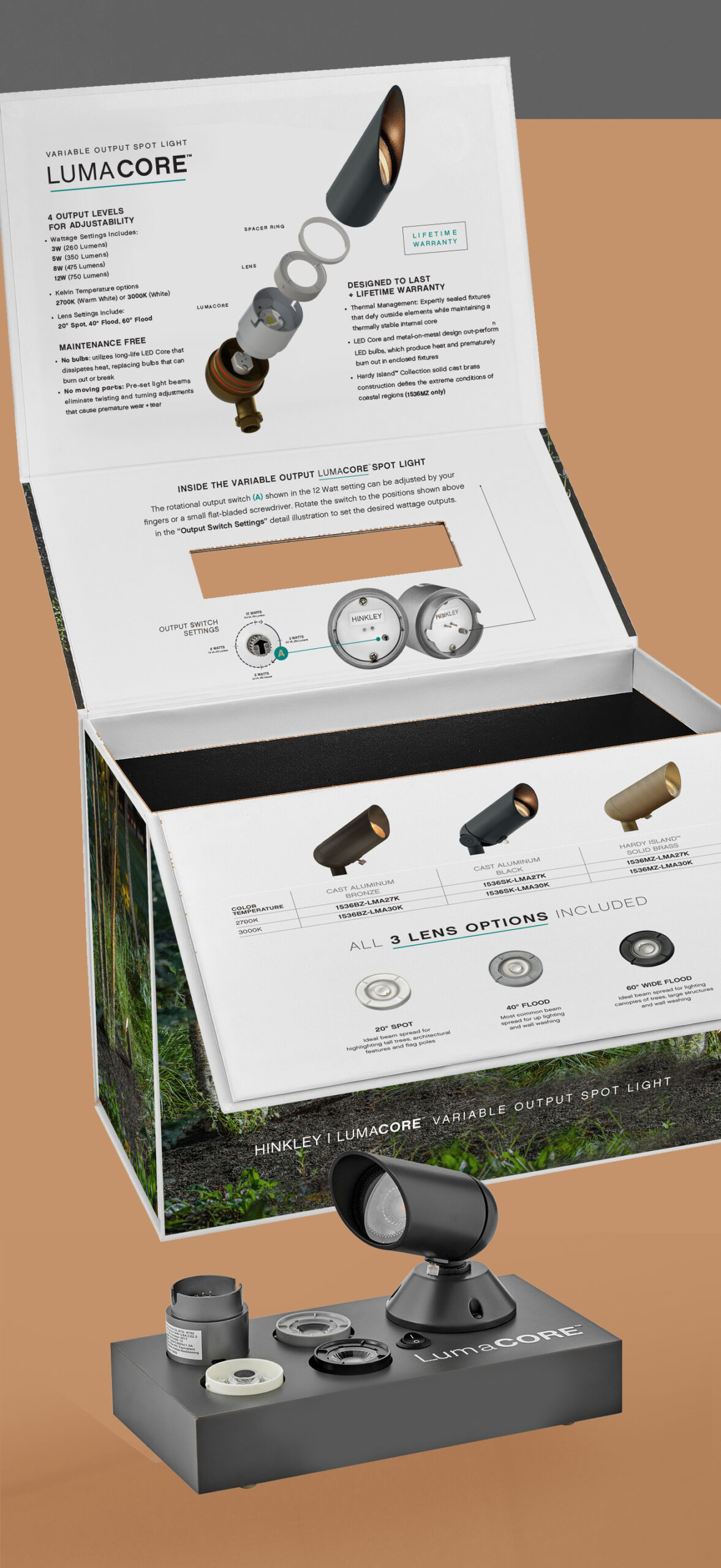 Challenge: A premium landscape lighting system needed a display kit for the landscape channel that reflected the quality of the product and supported hands-on sales and showroom environments. An initial plastic case concept fell short of the brand’s premium positioning, creating the need for a more refined, brand-aligned packaging solution.